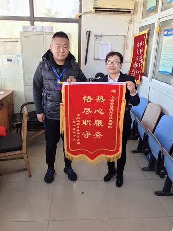 近日,学校崂山校区校卫队收到北苑物业工作人员赠送的锦旗。物业工作人员表示,感谢我校安保人员于2019年10月2日及时处置并劝导前来闹事的人员,维护了校园的日常运行和物业的正常工作。受赠的保安队长徐磊表示:作为BB贝博艾弗森官方网站一名校园安保人员,我们将严格执行学校BB贝博艾弗森官方网站和公司对我们的要求,更好的为学校师生服务,保障校园安全,我们将始终冲在第一线