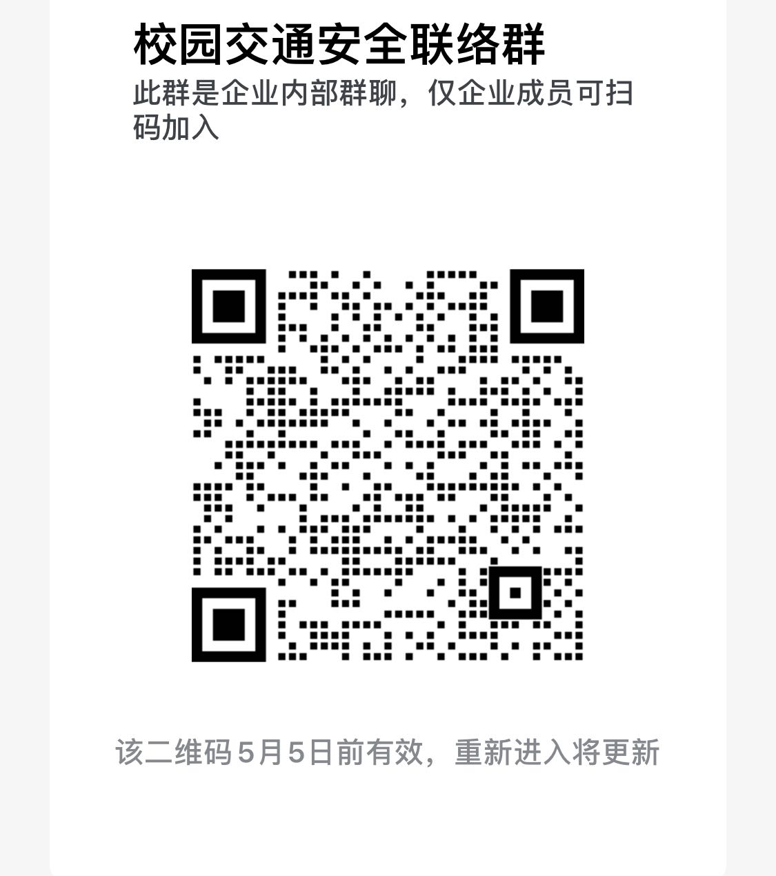 3.及时沟通协调。请各学院明确一位安全宣传员负责单位内的宣传联络工作,并于5月1日前加入企业微信“校园道路交通安全群”(见二维码)。保卫安全专班将加强与各单位保持联系,及时反馈有关信息,确保专项整治期间各类问题得到有效妥处。各专班、各单位有关安全教育落实情况以及合理建议,请及时报送BB贝博艾弗森官方网站。