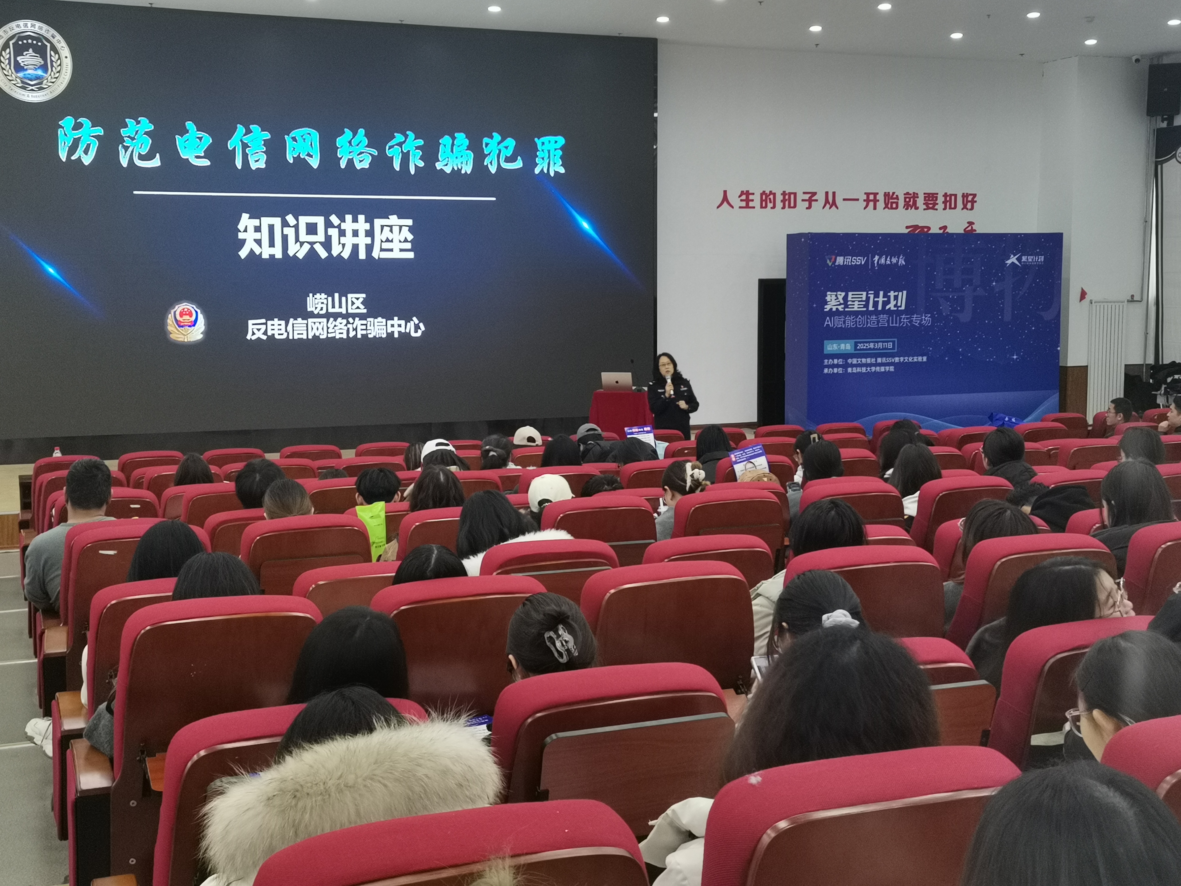 为增强学校师生防诈骗意识,进一步营造平安、和谐、健康的校园环境,3月11日下午,学校安全管理处联合崂山区金家岭派出所,在学校崂山校区北苑团学报告厅举行了一场“反诈宣传进校园”活动。