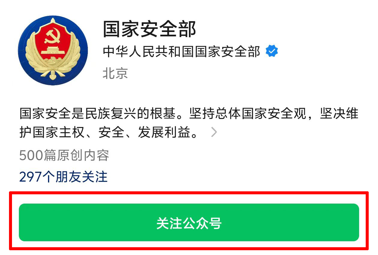 2023年8月1日,国家安全部官方微信公众号正式上线。作为国家安全部官方信息发布的权威渠道,该公众号主要提供最新的国家安全知识科普、国际国内形势分析、反间防谍警示案例等内容,是开展国家安全教育、学习国家安全知识的绝佳平台。