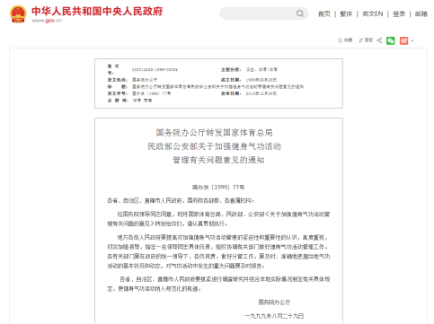 ▲中国政府网登载《关于加强健身气功活动管理有关问题的意见》